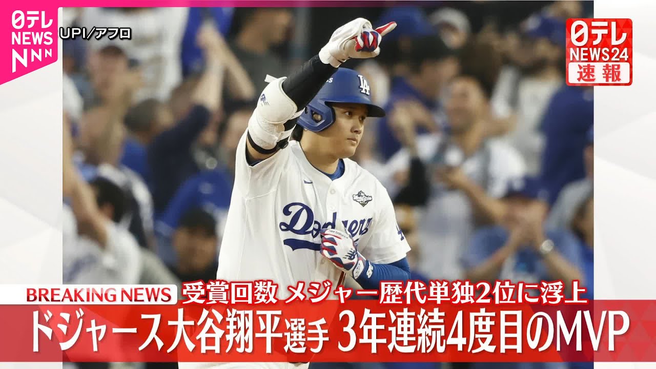全米野球記者協会に所属する記者30人の投票で決まるメジャーリーグのMVPが発表され、ドジャースの大谷翔平選手がナショナル・リーグのMVPを獲得しました。大谷選手のMVP獲得は3年連続4度目です。